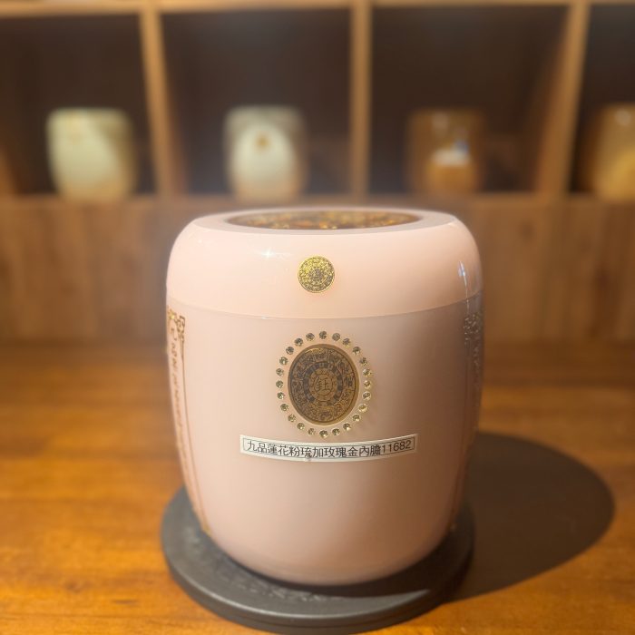 整體罐身以柔和粉琉呈現,搭配環繞《般若波羅蜜多心經》金漆雕刻,字字分明,象徵智慧與慈悲的圓滿融合。