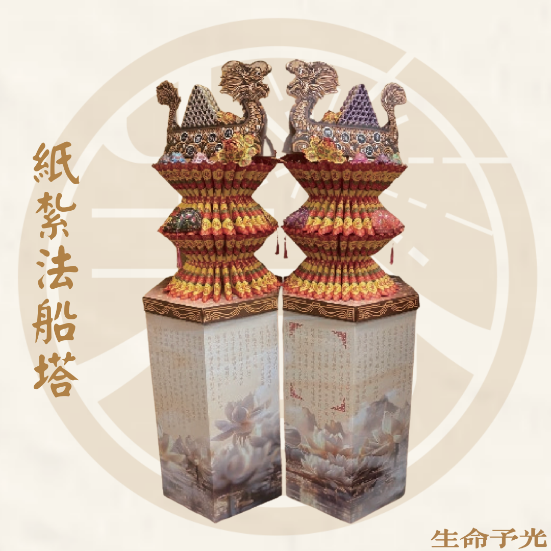 以蓮花塔為主體,塔頂設計為龍首紙紮法船,船身以(仿)紙鈔裝飾為主,象徵財施功德、護航往生者橫渡苦海、乘願成佛。整體設計穩重大器,是祭祀超渡中具象徵意涵的主塔之一。