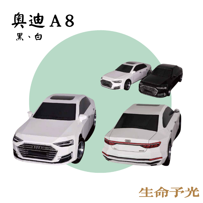 此款為:紙紮奥迪 A8 ※材質:精緻紙材 ※台灣製造、品質優良可靠 ※紙紮用品附受用紙、封條 ※紙紮顏色:白色/黑色(仿真) ※紙紮尺寸:71x38x22.5cm公分
